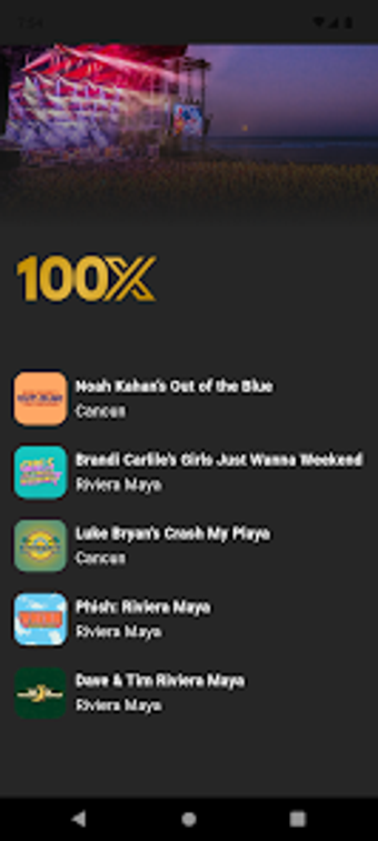 La aplicación 100x Presents es una herramienta esencial para disfrutar de experiencias musicales en destinos específicos. Incluye eventos destacados como 'Out of the Blue' de Noah Kahan, 'Crash My Playa' de Luke Bryan, y 'Girls Just Wanna Weekend' de Brandi Carlile, entre otros. Cada evento cuenta con su propio espacio dentro de la aplicación, donde los usuarios pueden acceder a toda la información necesaria antes y durante el evento.